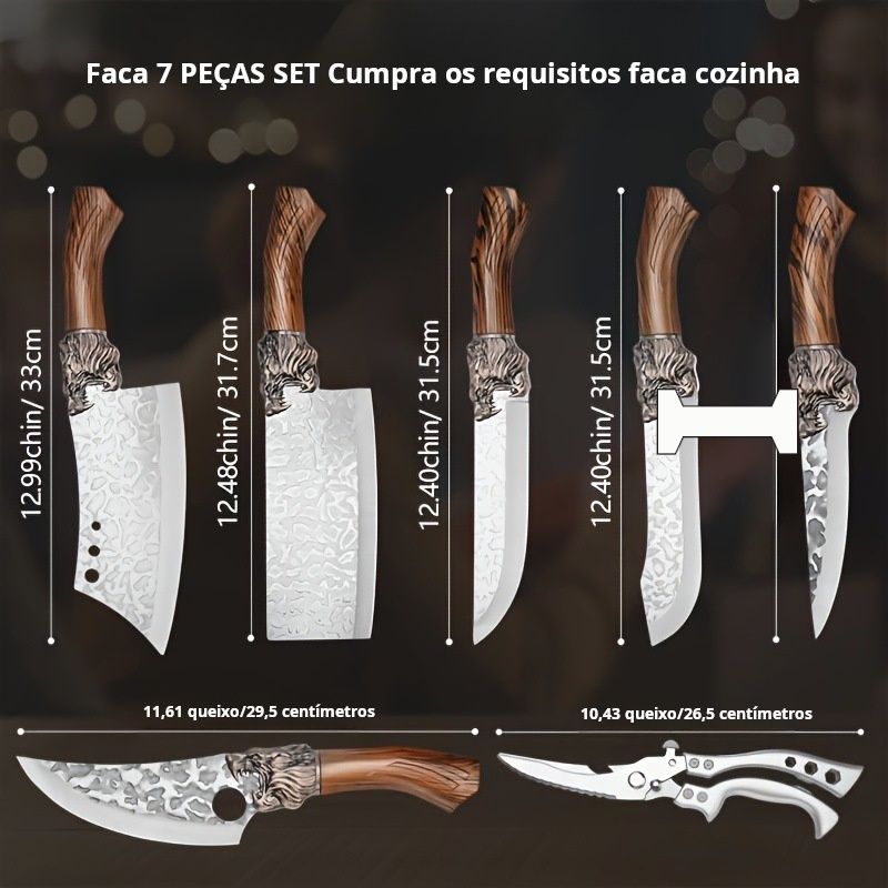Conjunto de facas de cozinha em aço inoxidável feito à mão com 7 peças, faca de chef, faca de corte, faca de talho, tesoura de cozinha, faca de corte de pato e peixe, um conjunto multiusos